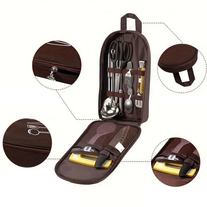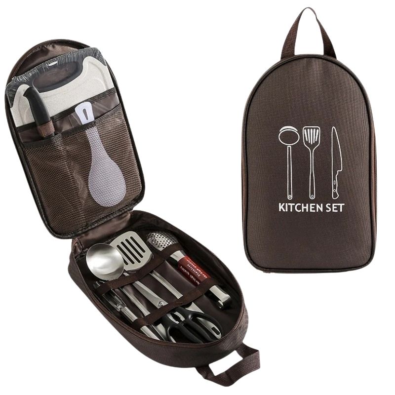 Håller ordning på alla köks- och matlagningsredskap när du lagar mat utomhus.