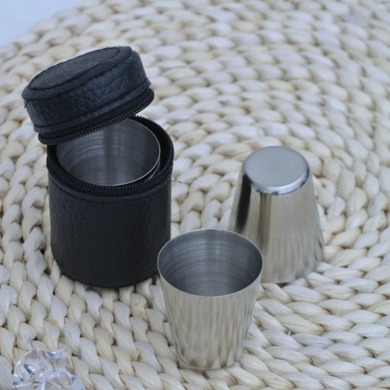 Detta set med shotglas i rostfritt stål är framtaget för camping, vandring och friluftsliv där slitstyrka, låg vikt och enkel packning är viktigt. Setet innehåller fyra stapelbara koppar som förvaras i ett praktiskt läderfodral, vilket gör dem enkla att ta med i ryggsäck, bil eller campingutrustning. Den kompakta designen gör att glasen tar minimalt med plats samtidigt som de är redo att användas när tillfälle ges.