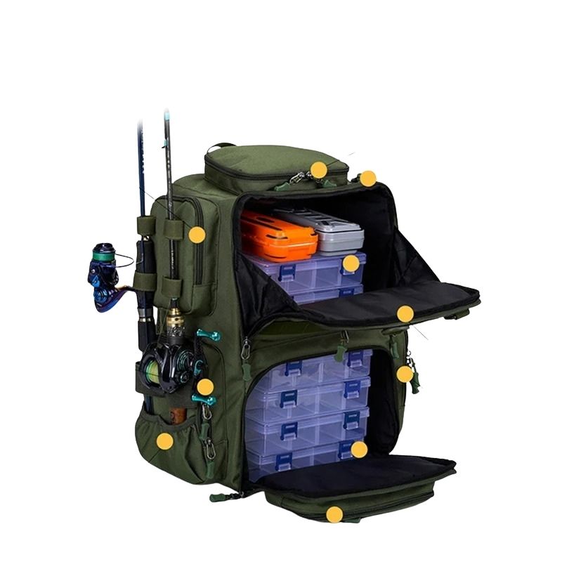 Ryggsäcken har en genomtänkt design med ett stort huvudfack, frontfickor och sidofack för organiserad packning. De många fästpunkterna gör det enkelt att hänga på utrustning som fiskespön, karbiner eller vandringsstavar. De vadderade axelremmarna och den ventilerande ryggpanelen ger hög komfort även vid långvarig användning. Den robusta bärremmen gör den smidig att bära även som handbagage. Perfekt för dagsutflykter, fiskeäventyr och längre turer i terräng.